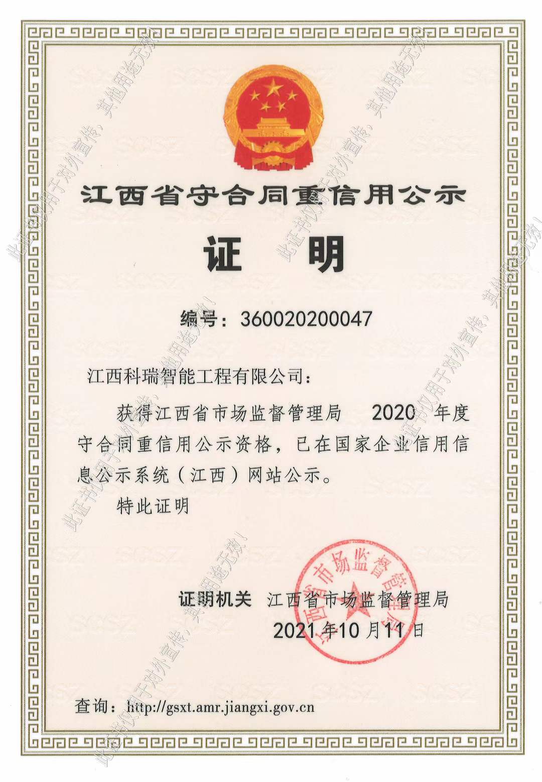 此次被評(píng)為江西省“守合同重信用”企業(yè),是對(duì)我公司誠(chéng)信經(jīng)營(yíng)、精耕細(xì)作的充分肯定。未來(lái),科瑞智能也將一如既往地堅(jiān)持以誠(chéng)取信,以信立譽(yù)的原則,不負(fù)每一份肯定。